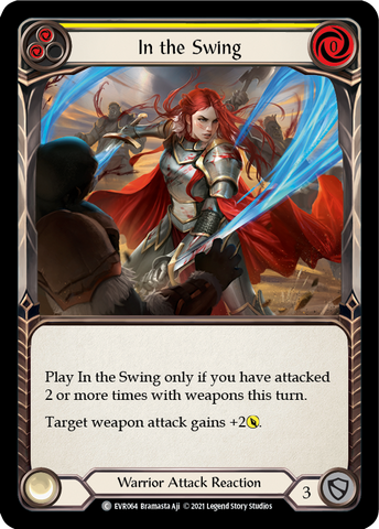 Play In the Swing only if you have attacked 2 or more times with weapons this turn. Target weapon attack gains +2[Power].