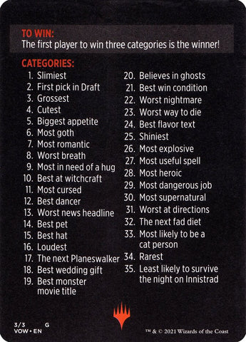 The Judge chooses a category from the list on the back of this card (either their favorite or at random). The other players each secretly submit a card from their pack that they think fits the category.